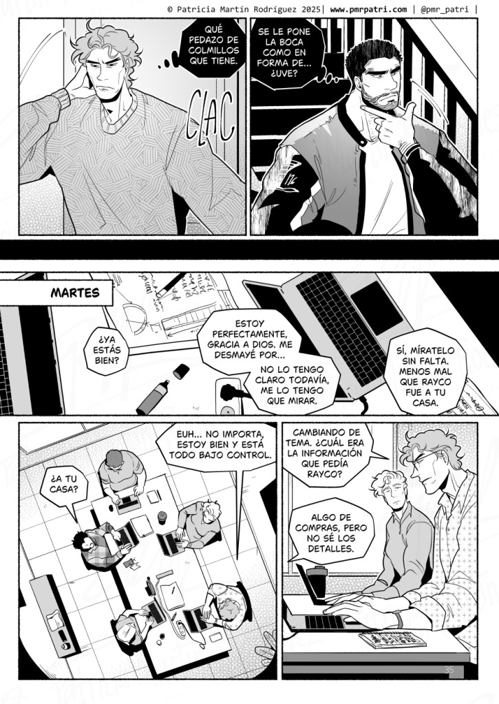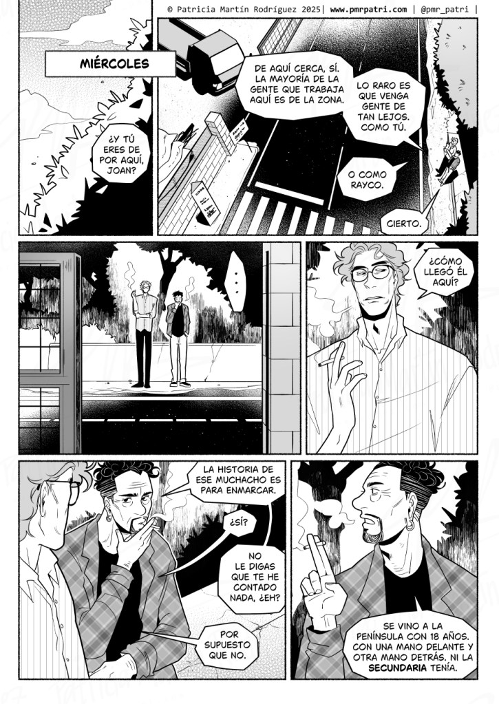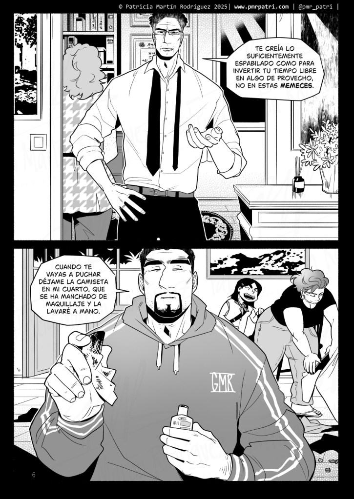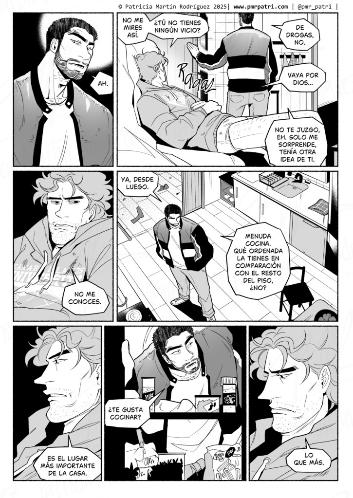Me flipa cómo utilizas las texturas y los grises para lograr un equilibrio en cada viñeta, que no se vea plana pero sea fácilmente legible. Si en algún momento haces un how to comic sobre eso, estaría interesadísima.